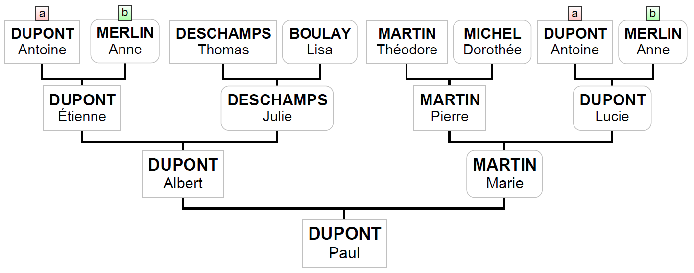 Ces deux personnes, repérées dans l’arbre par les étiquettes « a » et « b », sont les parents d’Etienne Dupont, grand-père paternel de Paul, et de Lucie, la grand-mère maternelle de Paul. Celui-ci descend donc deux fois d’Antoine et Anne.