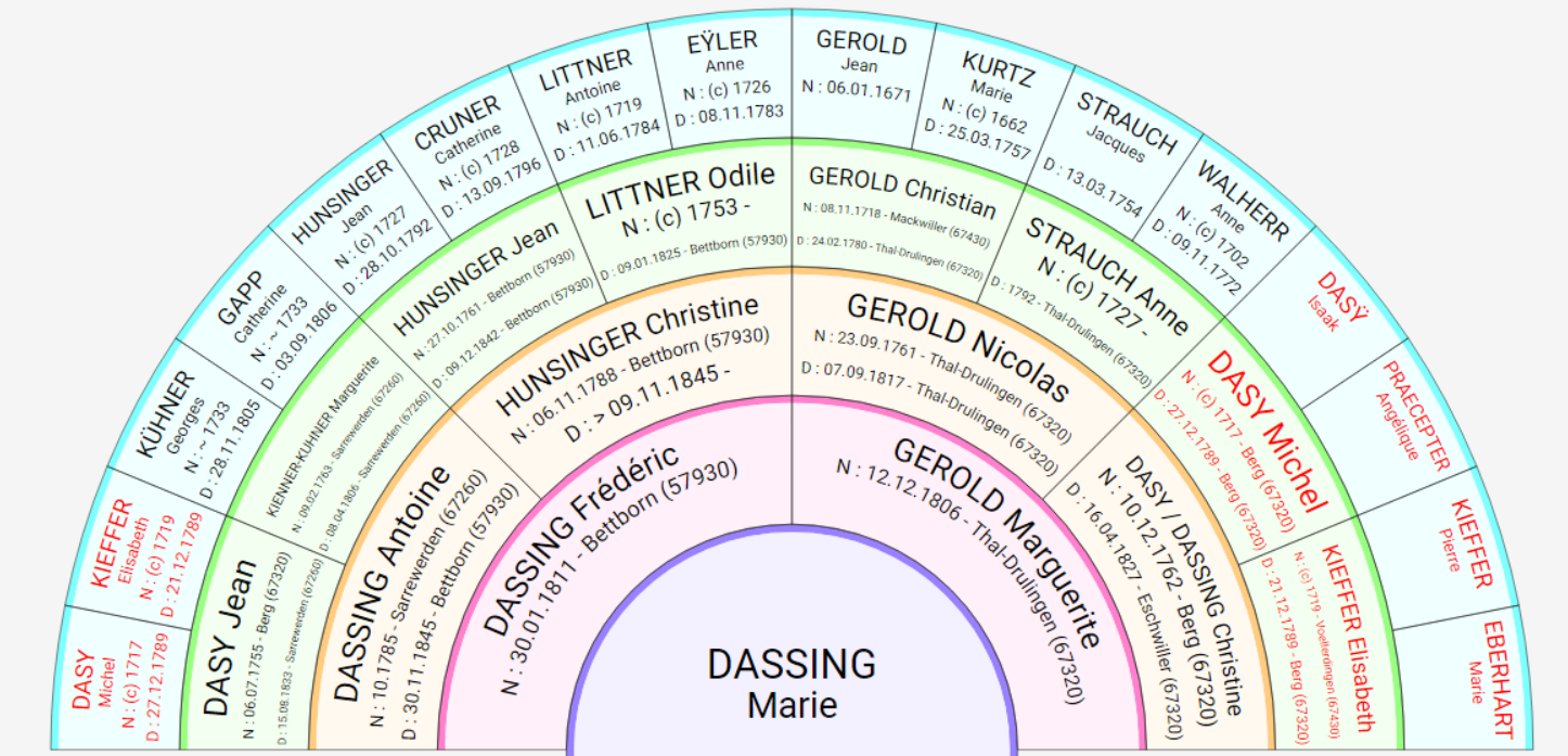 Intéressons-nous à présent à une généalogie ascendante réelle, celle de Mme Marie DASSING. Elle est représentée ci-dessous par une demi-roue sur laquelle il est possible de mettre l’implexe en évidence en utilisant la couleur rouge pour le couple présent 2 fois dans l’ascendance. Il s’agit de Michel Dasy et Elisabeth Kieffer qui sont d’une part des arrière-arrière-grands-parents paternels et d’autre part des arrière-grands-parents maternels La particularité de cet implexe est donc que ce couple figure sur deux générations différentes dans l’ascendance de Marie. Il en résulte que les parents de Marie, Frédéric Dassing et Marguerite Gerold sont cousins au 5ème degré.